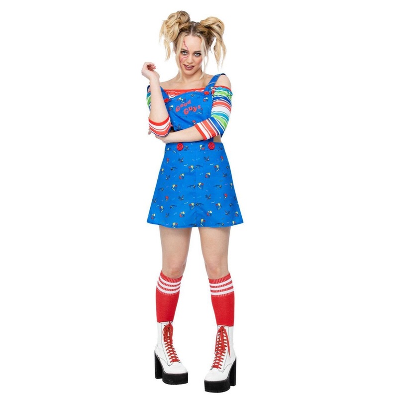 Licensed Chucky Halloween fancy dress costume consisting of pinafore mini dress and off the shoulder top.SizeDressBustWaistHipSmall8-1034 ''-35 ''26 ''-27 ''37''-38''Medium12-1437''-38 ''29''-30 ''39 ''-41''Large16-1840''-42''32''-34''42 ''-44 ''Note: Meas