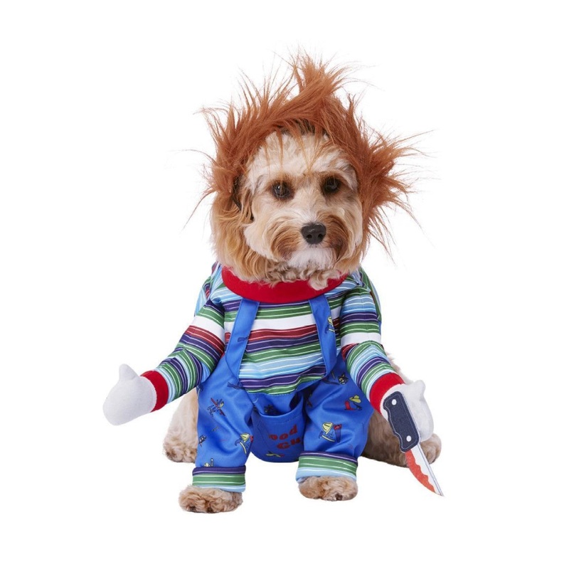 Officially licensed Chucky pet costume available in 3 different sizes with iconic blue dungarees with knife and includes wig.SizeLengthNeckChestSmall24cm38cm70cmMedium27cm44cm82cmLarge30cm54cm98cmNote: Measurements are manufacturer's guide.