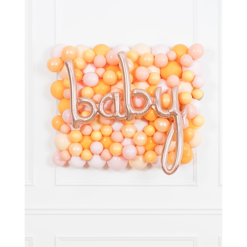 Our fun balloon backdrop boards add pop to any photo op. This 30″x40″ piece includes an air-filled rose gold BABY script balloon and colorful balloons designed in a citrus palette. Place above sweet’s table or on photo backdrop wall. Complete the look with matching balloon bouquets.