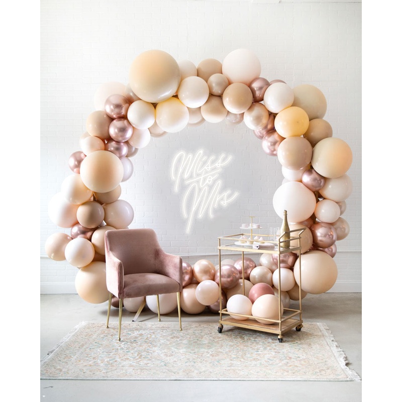 Set includes:circular frame with balloon garland and neon.Rental: Includes install and tear down.Inflated with air - this item will not float.Handcrafted piece. May vary from picture.FeaturesThisset includes:-8x8 Circular Gold Frame-Balloon Garland-Miss to