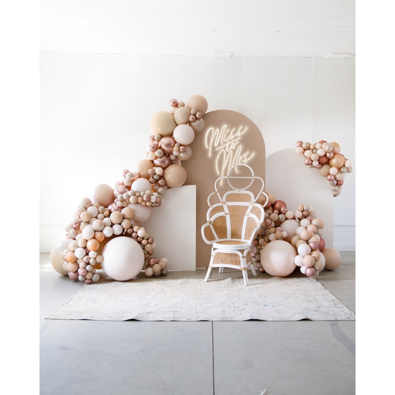 Set includes:panels with balloon garlands and neon. Rental: Includes install and tear down. Inflated with air- this item will not float. Handcrafted piece. May vary from picture.FeaturesThis set includes:-Panels-Balloon Garlands- Miss to Mrs Neon SignStand