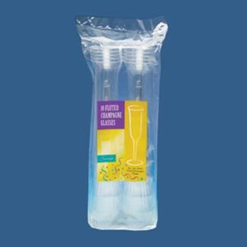 Enhance your presentation with our Clear Plastic Fluted Champagne Glasses featuring a sleek modern style and design to suit your serving needs These disposable 2piece Clear Plastic Fluted Champagne Glasses are durable and coordinate with any table setting perfect for any Holiday gathering New Years Party or any special event Each package includes 10 Clear Plastic Fluted Champagne Glasses each with a 5oz capacity and are NOT dishwasher or microwave safe hand wash ONLY