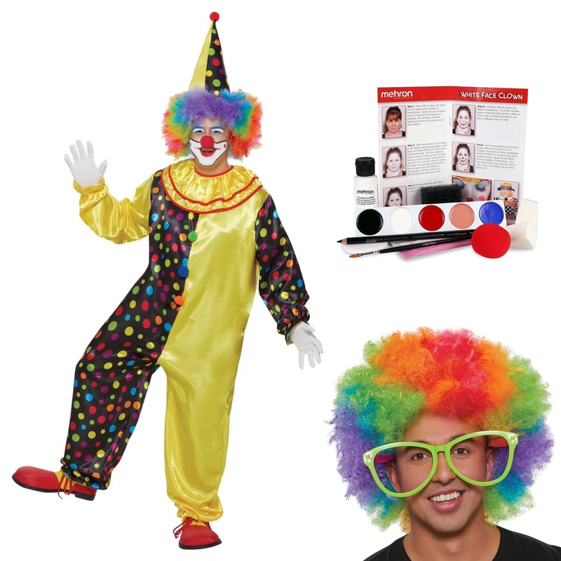 Dress up as a funny clown with this all-in-one costume kit! Perfect for Halloween parties and trick or treating with kids, get everything you need in one simple bundle. Stand out this Halloween season!