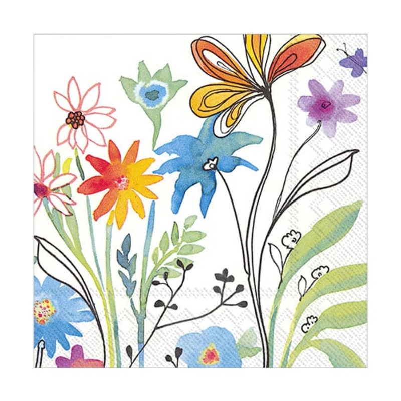 A blossomly delightful napkin featuring an all-over design of different watercolor flowers against a white background. Perfect beverage /cocktail napkin for various occasions. The pack includes 20, 5" x 5" napkins that are 3-ply and printed in Germany usin
