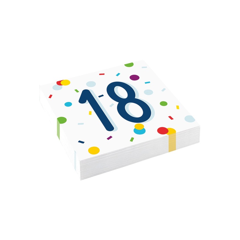 Pack of 20 colourful confetti 18th birthday party napkins.