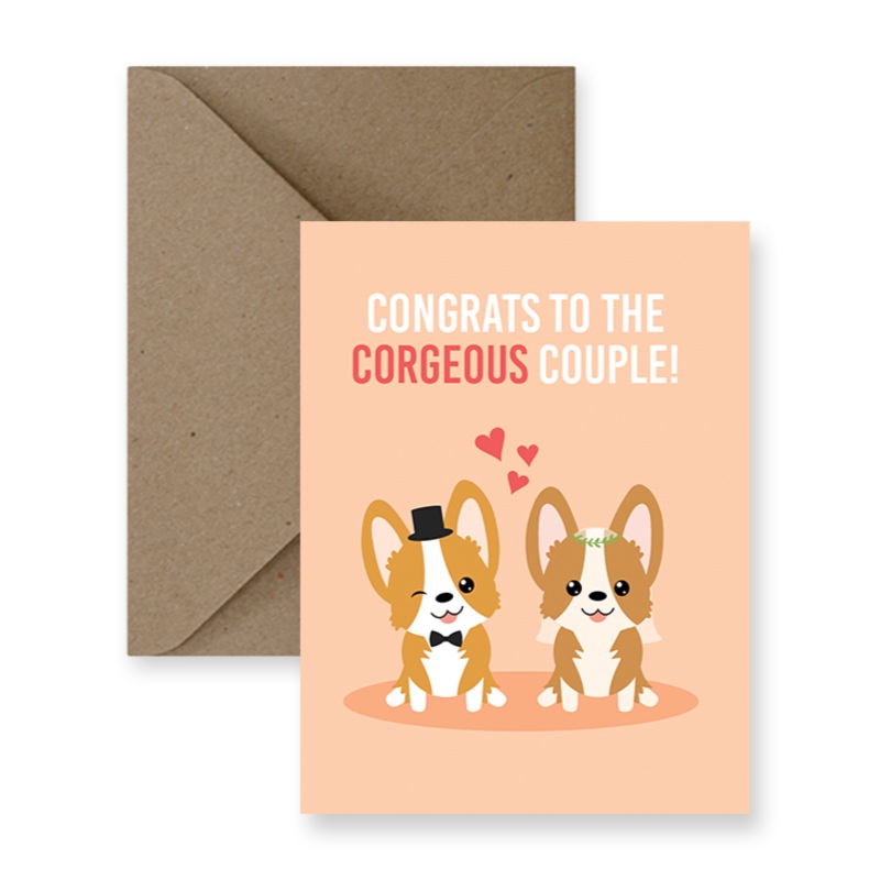 Know any dog lovers getting married or just got engaged? Say congrats with this cute card that will sure to bring a smile to any corgi parents.