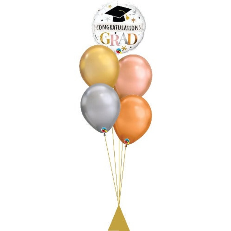 - One helium filled 18" Congratulations Grad Rose Gold foil balloon- Four helium filled premium 11" latex (1 chrome gold, 1 chrome rose gold, 1 chrome silver, 1 chrome copper)- Treated with Hi-Float to increase float time- Matching ribbons- Coordinating we