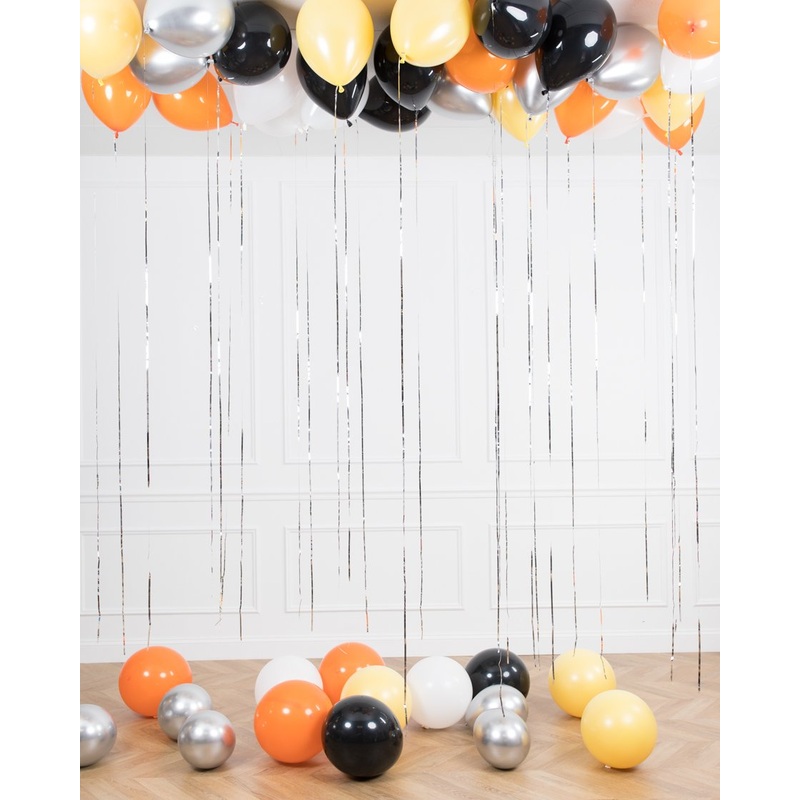 Turn any room into a party with this set of ceiling and floor balloons. Designed in the construction themed palette of yellow, orange, black,white and silver, these balloons fill your space in snap.