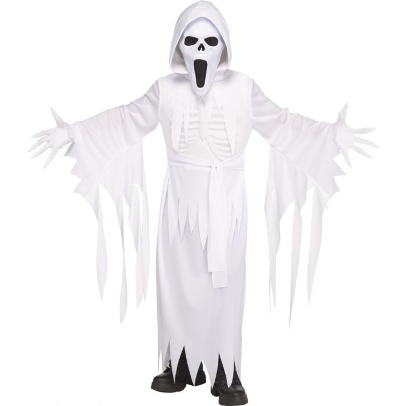 Le costume inclut une robe capuche fluide avec ceinture, des gants doigts longs et rembourrs, un masque de fantme effrayant, et une pice thoracique en mousse EVA fusionne pour un rendu raliste et dimensionnel.