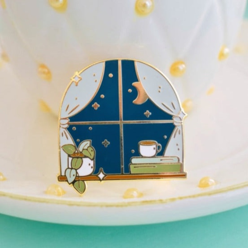 A perfect cozy night is thislittle corner by the window, perfect for curling up with a cup of your favorite hot drink and a good book. The pin is made with hard enamel and polished gold-colored metal plating. It has two posts on the back for extra security
