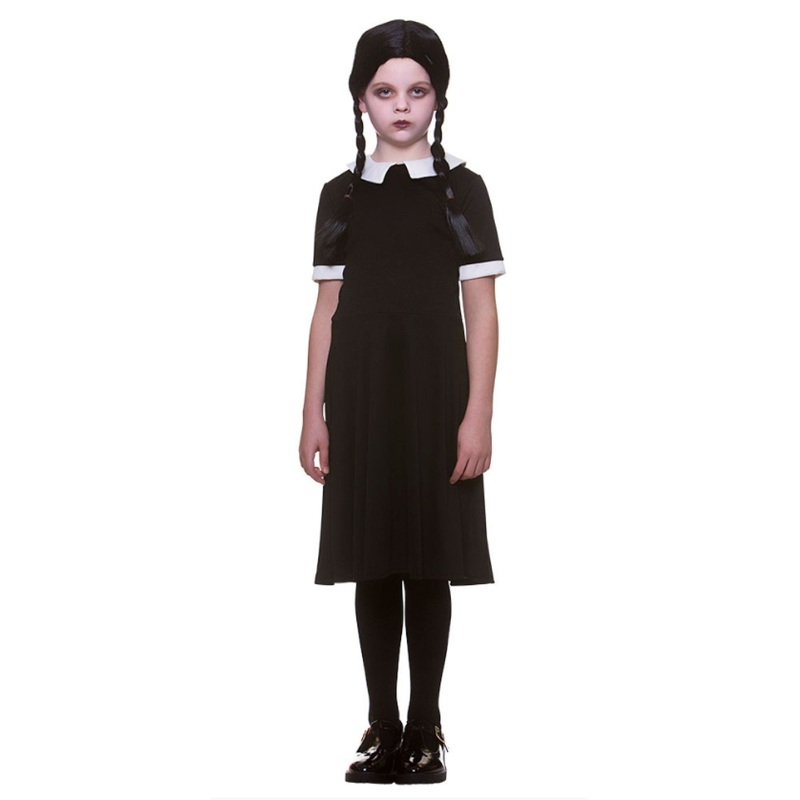 Creepy School Girl Halloween fancy dress costume which comes with black dress finished with white neck and sleeve trim along with a black plaited wig.SizeAgeHeightSmall3-4 years110-122cm Medium5-7 years122-134cmLarge8-10 years134-146cmExtra Large11-13 year
