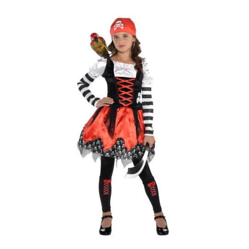 Our Crossbone Cutie Child Costume will make your girl look fierce and cute at the same time with its black, white, and red dress. This Halloween costume also includes a red headscarf with a skull and crossbones print, and black leg warmers. Additional costume accessories and props shown in the image are sold separately.