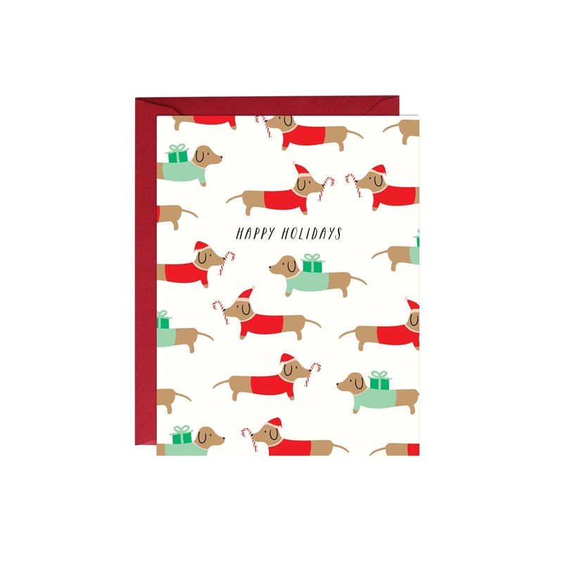 Send warm holiday greetings with the help of Santa Paws! This card is perfectly festive for wishing anyone Happy Holidays.A2 size card (4.25 x 5.5)Printed on natural white card stockIncludes matching envelope