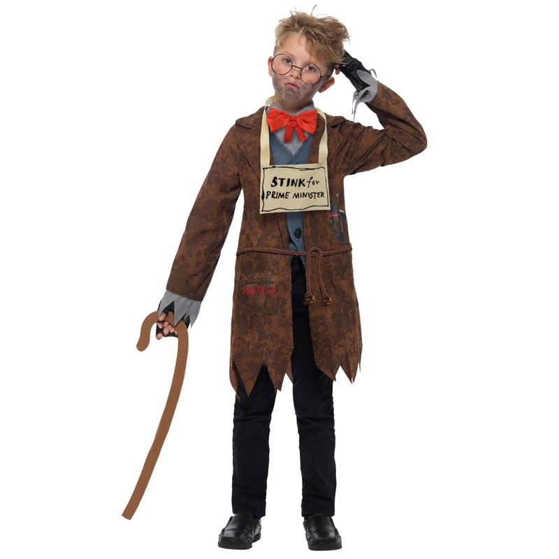 Deluxe 7-piece Mr Stink character costume from David Walliams book consisting of brown jacket with attached belt and mock waistcoat and shirt with 'burp' sound chip, red bow tie, walking stick, glasses, Stink for Prime Minister felt sign and a pair of blac