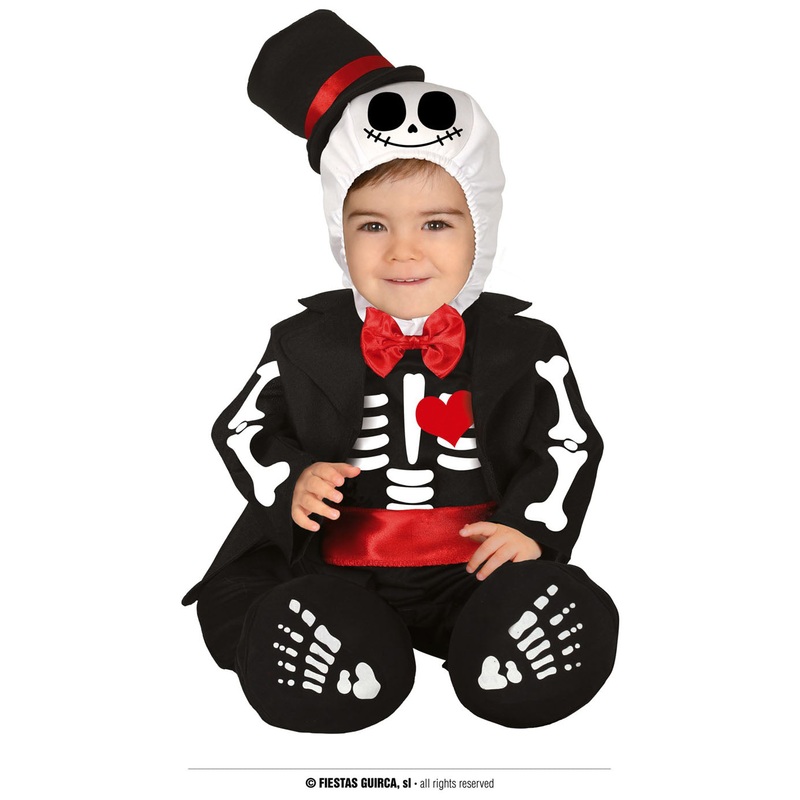 Mister Skeleton baby Halloween costume including hood with hat, jumpsuit with bow tie and pair of feet booties.