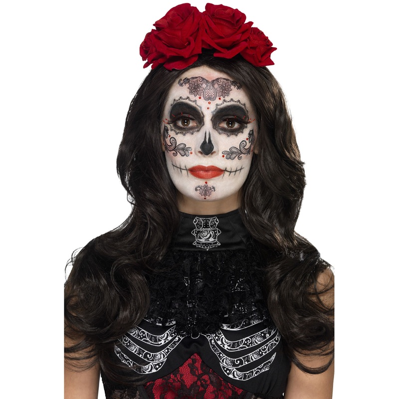 Day of the Dead Glamour make up kit consisting of facial tattoo transfers, red white and black face paint pallet, black eyelashes, red gem stickers & make up applicators.