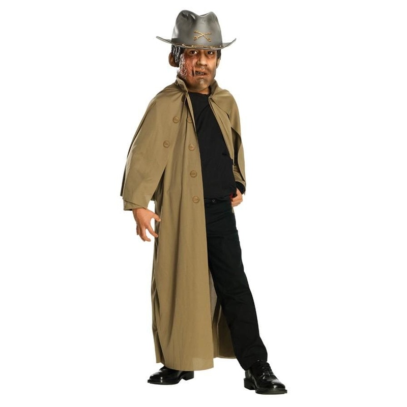 Be the cynical western bounty hunter and wear this Jonah Hex costume for Halloween or costume parties The Jonah Hex Boys costume includes grey cavalry hat long tan coat with capelet and button detailing and the character mask