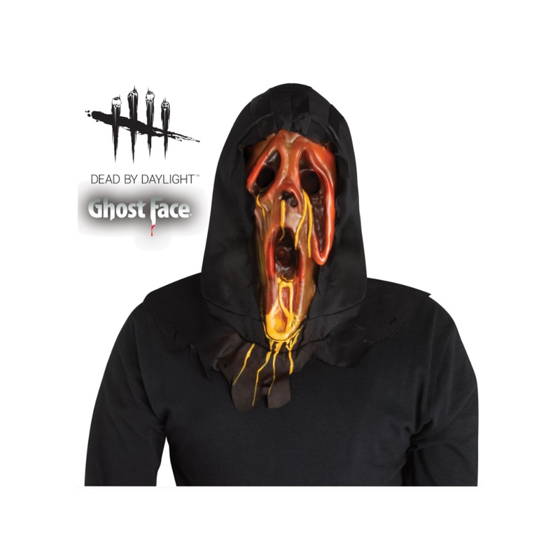 Scorched face Dead By Daylight licensed mask with black hood.