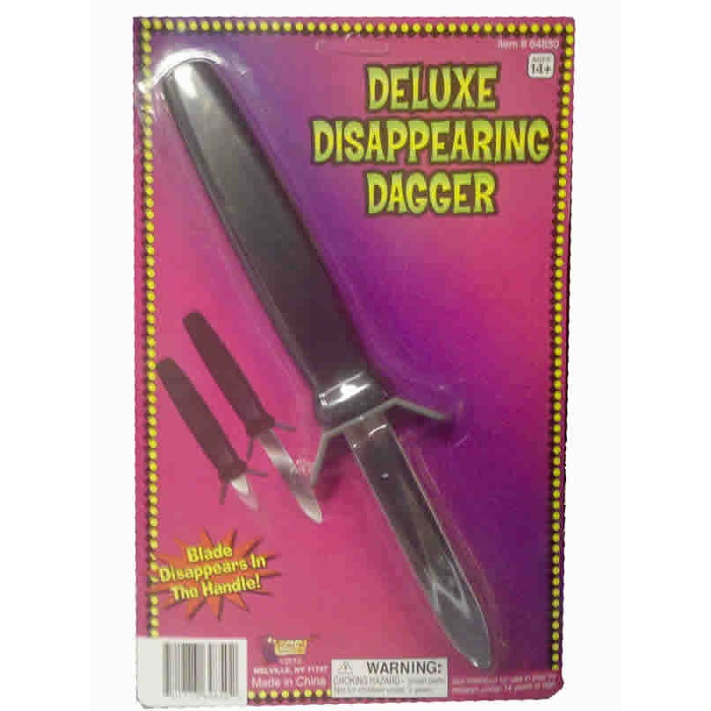 Our Deluxe Disappearing Dagger is just what you need to complete a costume for Halloween, Theater, or Masquerade. This pack includes one dagger that is made with plastic and can easily retract the blade. Packaging recommends this product for ages 14 and ol