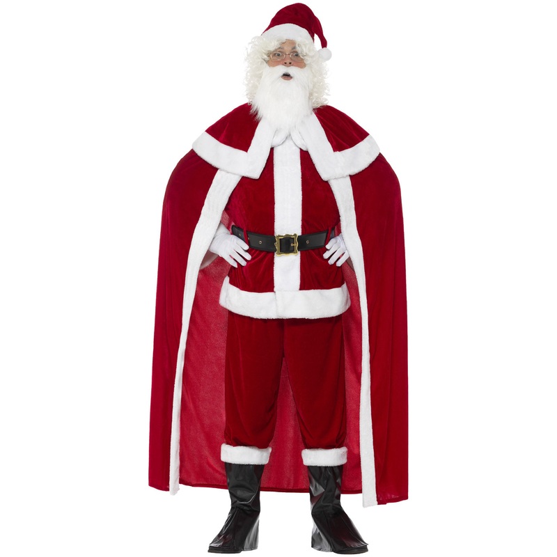 Deluxe 8-piece Father Christmas costume in traditional red and white with elasticated trousers, top, full length cape, belt, black boot covers, a pair of white gloves, beard and hat.SizeChestWaistInside LegMedium38''-40''32''-34''32 ''Large42''-44''36''-38