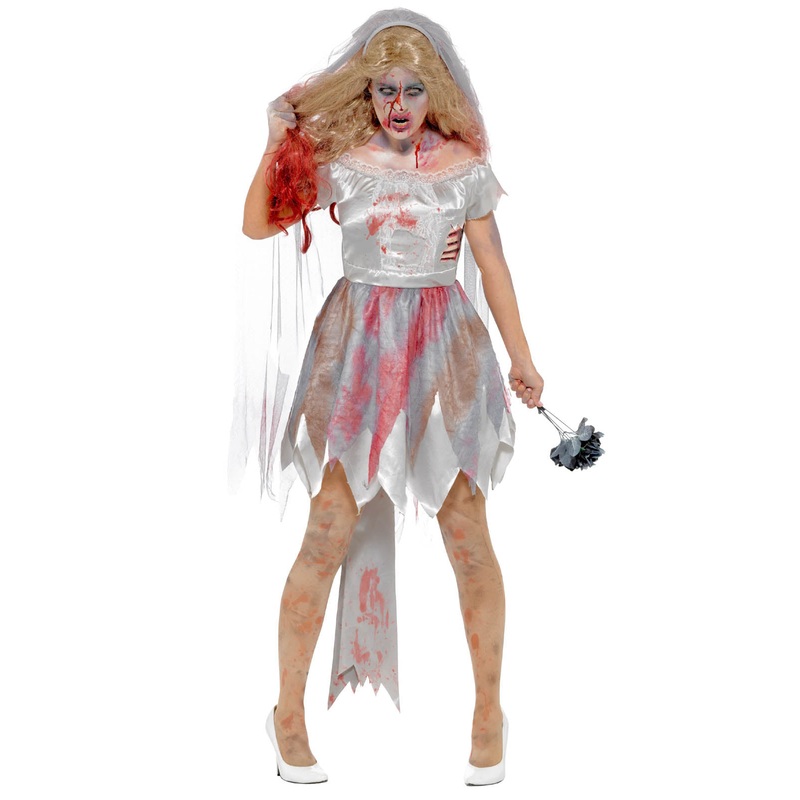 This zombie Bride Halloween costume comes with a grey distressed effect layered dress with blood stains and latex rib wound, long grey headband veil and bouquet of black roses.SizeDressBustWaistHipSmall8-1034 ''-35 ''26 ''-27 ''37''-38''Medium12-1437''-38