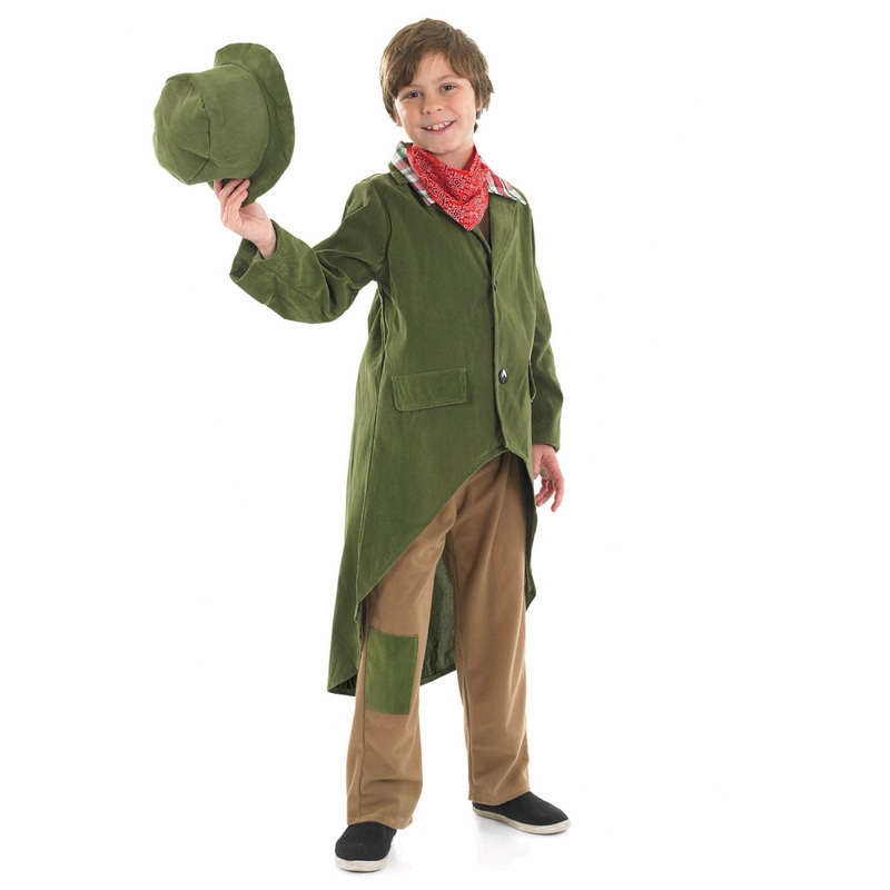 Deluxe Victorian boy's costume with trousers with patch, green jacket with tails and attached brown shirt, neck tie and hat.SizeAgeHeightSmall4-6 years110cmMedium6-8 years122cmLarge8-10 years134cmExtra Large10-12 years146cmNote: Measurements are manufactur