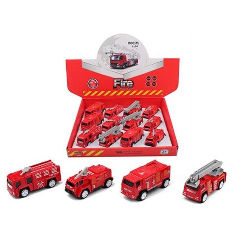 Pullback firetrucks with some moveable parts.Made from a combination of die-cast metals and plastic.Simply pull back on a flat surface for high-speed action.4 assorted designs.Size: 8.5cm