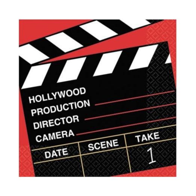 Lights Camera Action Directors Cut 2ply Beverage Napkins feature scene marker graphics in black and white on a red background Package includes 36 beverage napkins.