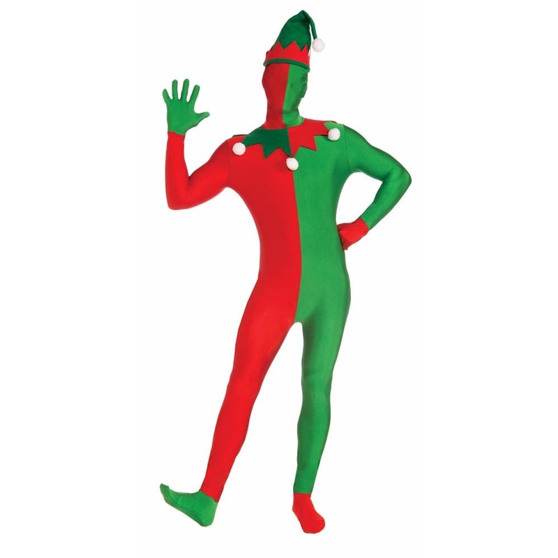 Looking for a quick Elf suit for the holidays Our Disappearing Elf Suit may be just for you This Disappearing Elf Suit is available in adult standard and XL sizes and includes a Disappearing Elf Hat a comfortable seethru hooded mask a jumpsuit with an attached collar gloves and red and green socks Additional Christmas accessories are available and sold separately