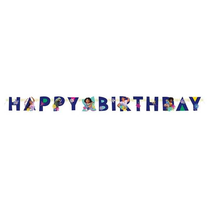 Wish your kid a happy birthday with this large letter banner that features characters from Disneys Encanto. Hang it over the doorway, above your party buffet table or on the wall as a backdrop for fun party photos.
