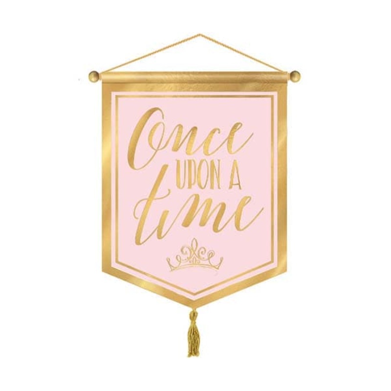 Dream of Once upon a Time in a far away land, and after announce to the world with the Once Upon a Time Banner. Measuring 14 5/8" x 9" and made of durable canvas it can be seen far and wide in true royal Pink and Gold colors. Put infront of your home for a