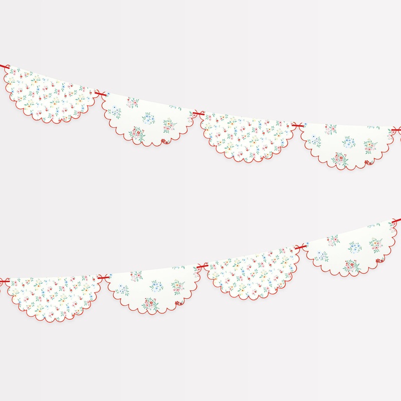 Dainty posy bouquets and ditsy floral clusters add effortless elegance to any setting. These classic designs are influenced by fashion-forward floral pattern trends, which include a touch of red to keep the look modern and fresh. This statement garland, with a stylish scalloped edge, will give a sophisticated look at baby showers, bridal showers, afternoon tea or garden parties. Hang it on a party table, wall or mantel or in a porch or window, for instant decor.