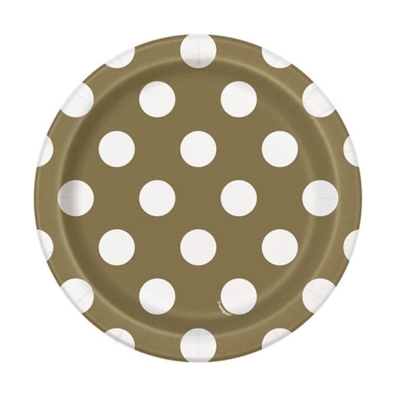 The Gold Dots tableware brings fun style to any table setting from birthdays to everyday use. These 7in paper plates featuring white dots on gold background are great for small appetizers, desserts and snacks. The package includes 8 plates.