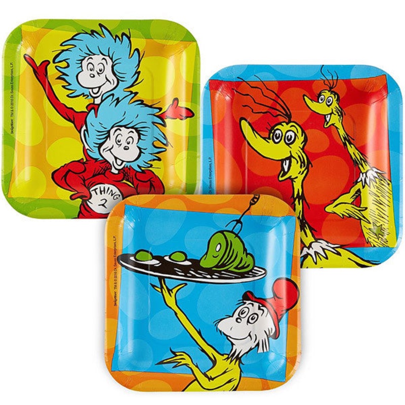 Have a snack with Thing 1 and Thing 2, enjoy a piece of cake with Sam-I-Am or try a tasty appetizer with Sneetches. These square luncheon plates feature 3 different Dr Seuss designs and the package includes 8 paper plates that measure 7in.