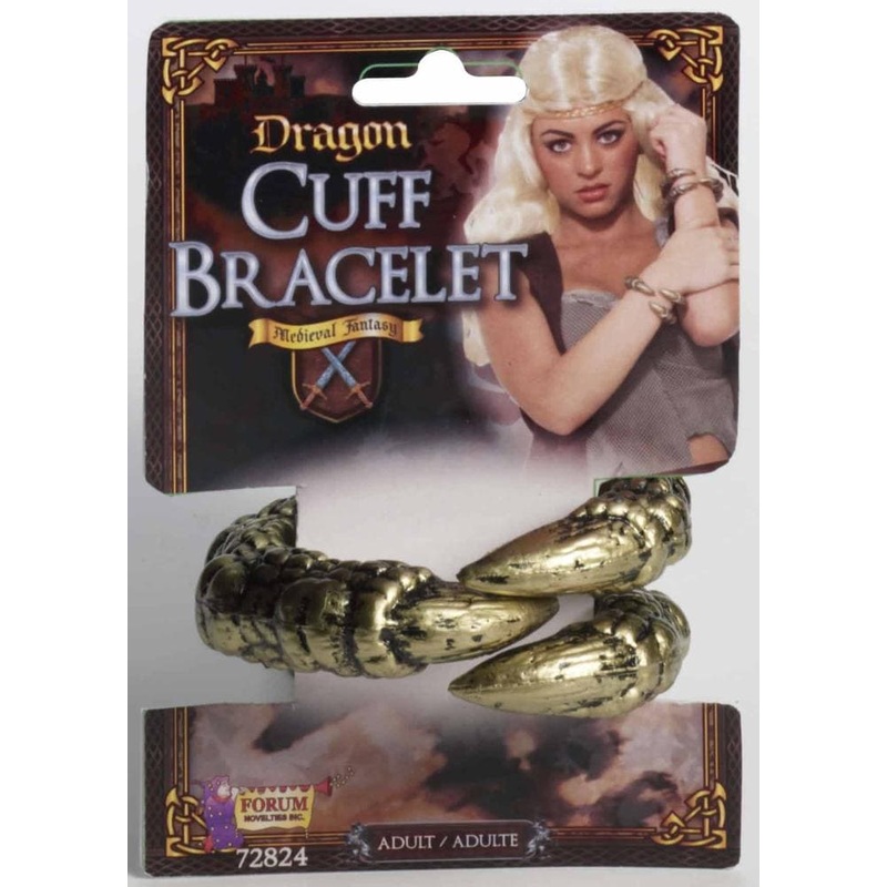 Accessorize your medieval costume with this Dragon Cuff Bracelet costume accessory for a more powerful look This Dragon Cuff Bracelet stretches to fit around the wrist Wear thisto fit medieval themes such as Skyrim Game of Thrones King Arthur Lord of the Rings and more Each bracelet is sold individually