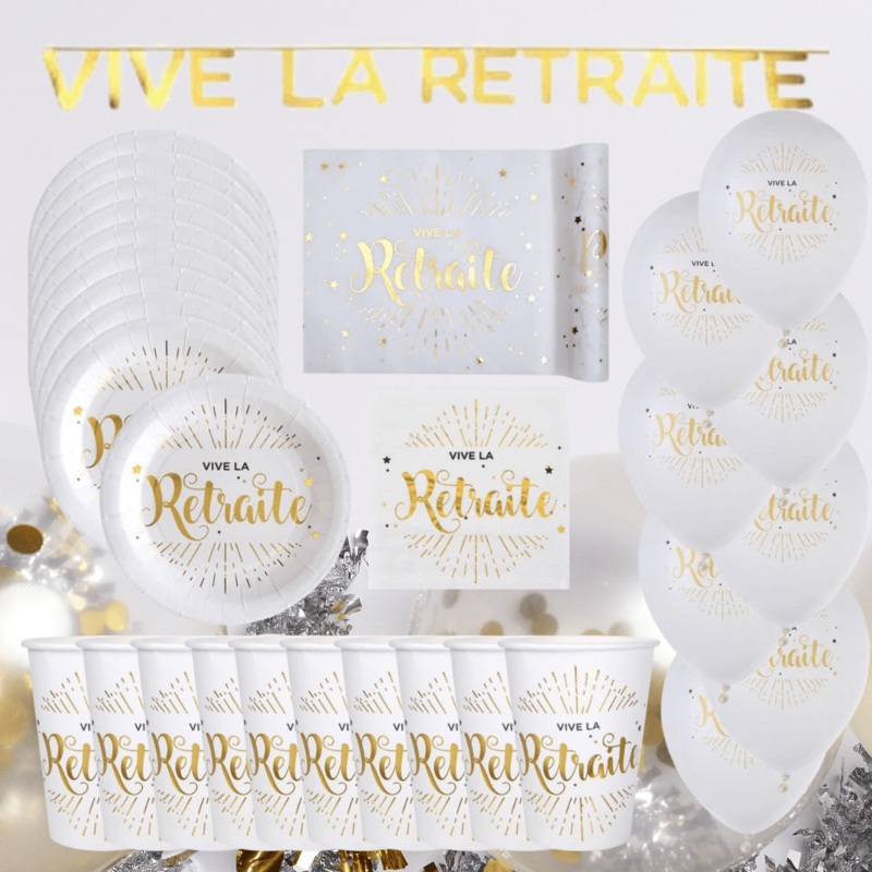 Prparez une fte de retraite mmorable avec notre ensemble complet de dcoration. Ce kit comprend tout le ncessaire pour une clbration lgante et festive : une bannire Retraite pour accueillir vos invits, des assiettes et verres assortis pour le service, des b
