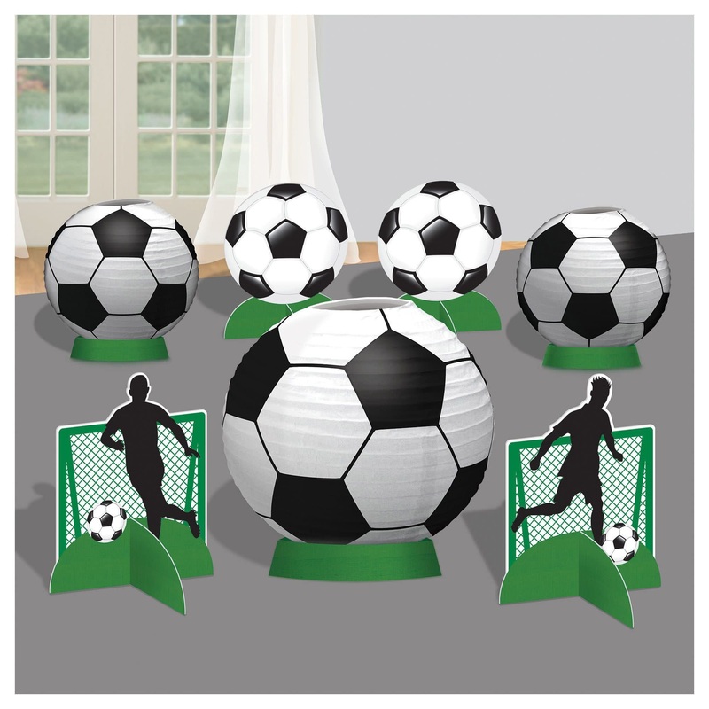Cet ensemble pour centre de table inspirera les fans de soccer montrer leur support. Il contient un centre de table de 9 1/2", 2 centres de table de 5" et 4 centres de table de 5 7/10" au thme du soccer.