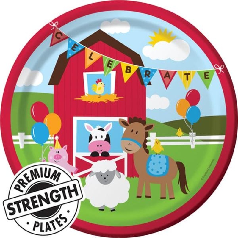 Head down to the farm with animal friends and party guests in our Farmhouse Fun ensemble! Made with premium strength, these round dinner plates feature a barn with animal friends ready to celebrate a birthday party! Coordinate these with touches of Classic Red and Fresh Lime colors. Set of 8.