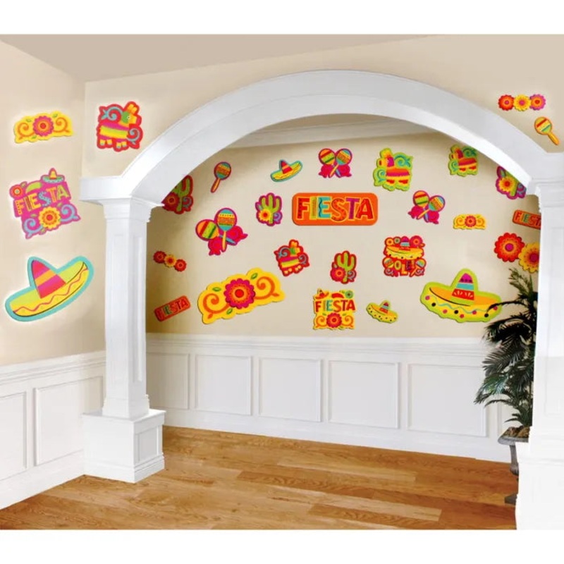 Fiesta themed cut out decorations.There are a total of 30 cardboard decorations in the pack as follows -* 6 pcs measuring 29.2cm.* 8 pcs measuring 17.7cm.* 16 pcs measuring 12.7cm.These look great stuck on the wall, windows or hanging from the ceiling at y