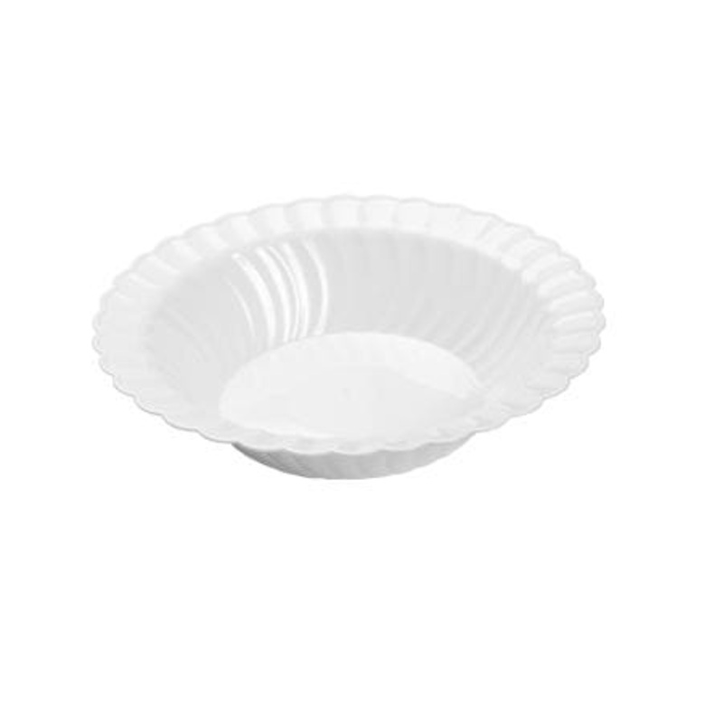 Our Flairware White Plastic Bowls are strong solid and sure to suit your serving needs Enhance any table setting with these round white plastic bowls featuring a simple yet bold wave design Package includes 18 plastic bowls each with a 10oz capacity