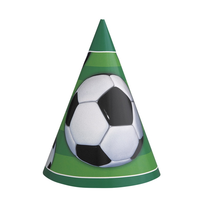 Pack of 8 football themed party hats with elasticated strap decorated with 3D football image.