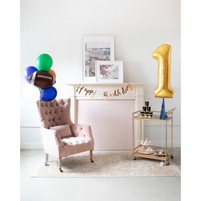 Bring your party together with this adorable and easy football themed birthday package. This set includes a football balloon bouquet, birthday banner and a gold foil number balloon, which easily transforms any room or sweets table.
