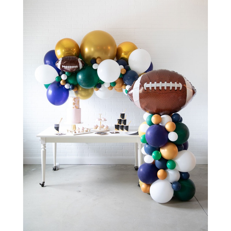 Create a statement for your kids football themed birthday party with our floating arch and column set. This includes a football themed floating balloon arch and matching column with a football themed mylar balloons to make a football birthday party extra fun.