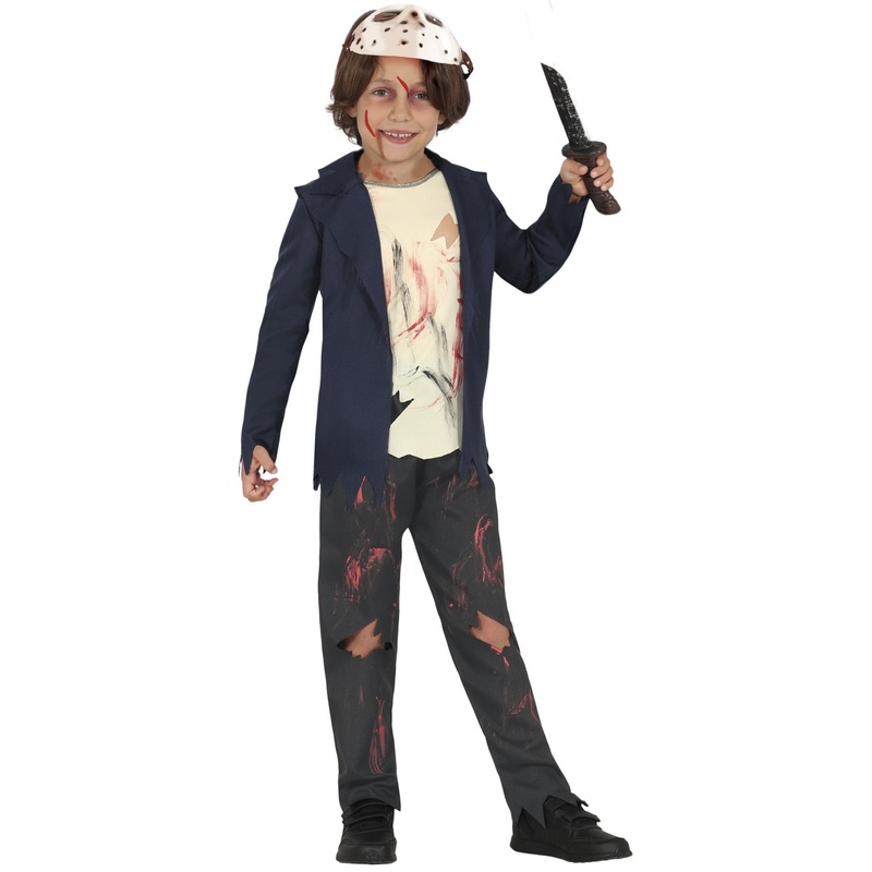 Halloween horror killer costume with face mask, dark blue jacket, bloody t-shirt and trousers.