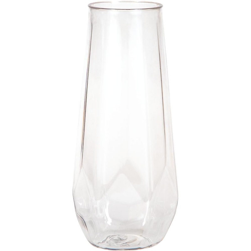 These Plastic Fractal Stemless Champagne Tumblers are perfect for any special occasion. Each tumbler holds 9 oz and is made of sturdy plastic that is both reusable and recyclable. Featuring an angular design with the appearance of glass and convenience of
