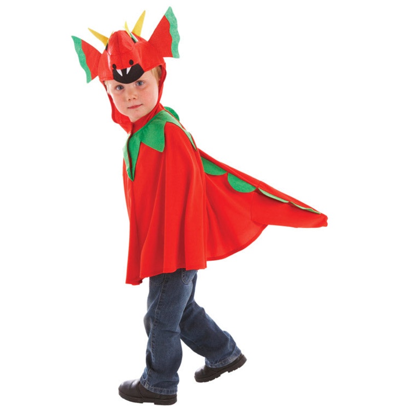 Child's dragon fancy dress costume includes red and green hooded robe with dragon head.Costume Size: One size (would fit up to age 8)