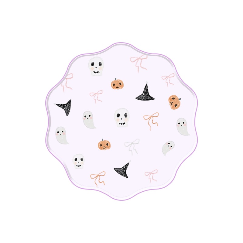 These Frightfully Adorable Large Scalloped Lunch Plates will be the sweetest addition to your Halloween table. With charming ghosts, pumpkins, bows and skulls on a pastel pink background, these 10-inch plates will bring smiles to every spooky snack time.Ma