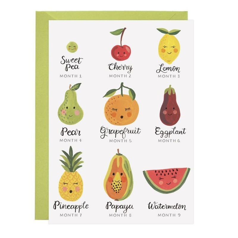 Congratulate the new mommy and daddy on the coming of their newest addition! The cover of this card shows the size of the baby in mama's belly at each month of her pregnancy!Inside: Congrats on your pregnancy & the journey ahead! Super thick cardstock A2 c