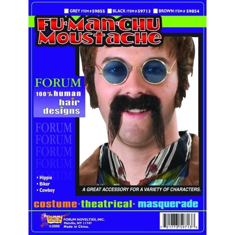 The Fu Manchu Moustache costume accessory is a long and straight moustache that is made for your Asian or Hippie Halloween costume This Fu Manchu Moustache costume accessory is self adhesive and could actually be used for any mix n match or Western costume