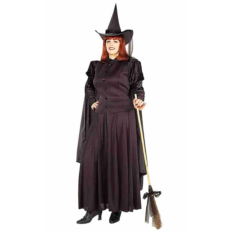 Bewitching at any hour this Classic Witch Costume features all black attire that includes a hat with an attached scarf, a cape, a top and long skirt ankle length. Adult plus size XL costume.